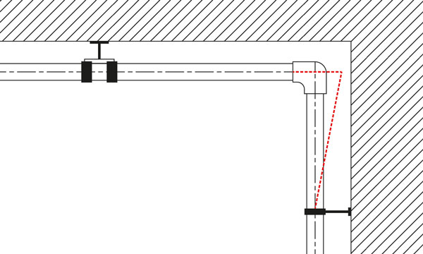 Si se utiliza un expansor en L, el punto libre en el brazo horizontal permite la expansión longitudinal. En el brazo vertical, el punto fijo fija el brazo corto de la tubería como contrafuerte. Esto permite la expansión sin dañar la tubería ni el punto fijo.