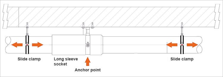 En este caso, la dilatación se absorbe en los manguitos largos fijados al cuerpo del tubo. Para no ejercer presión lateral sobre los manguitos, cada pieza de tubo se fija al menos dos veces.