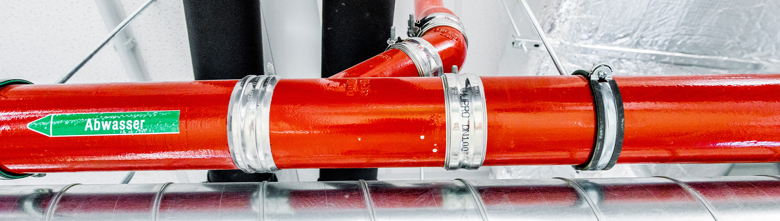 Hoy en día, las tuberías de aguas residuales suelen estar fabricadas con plástico (tubos de PP o PE), que difiere considerablemente de los tubos de fundición que se utilizaban anteriormente en cuanto a su comportamiento de dilatación ante cambios de longitud y su resistencia, es decir, su estabilidad ante cargas de presión.